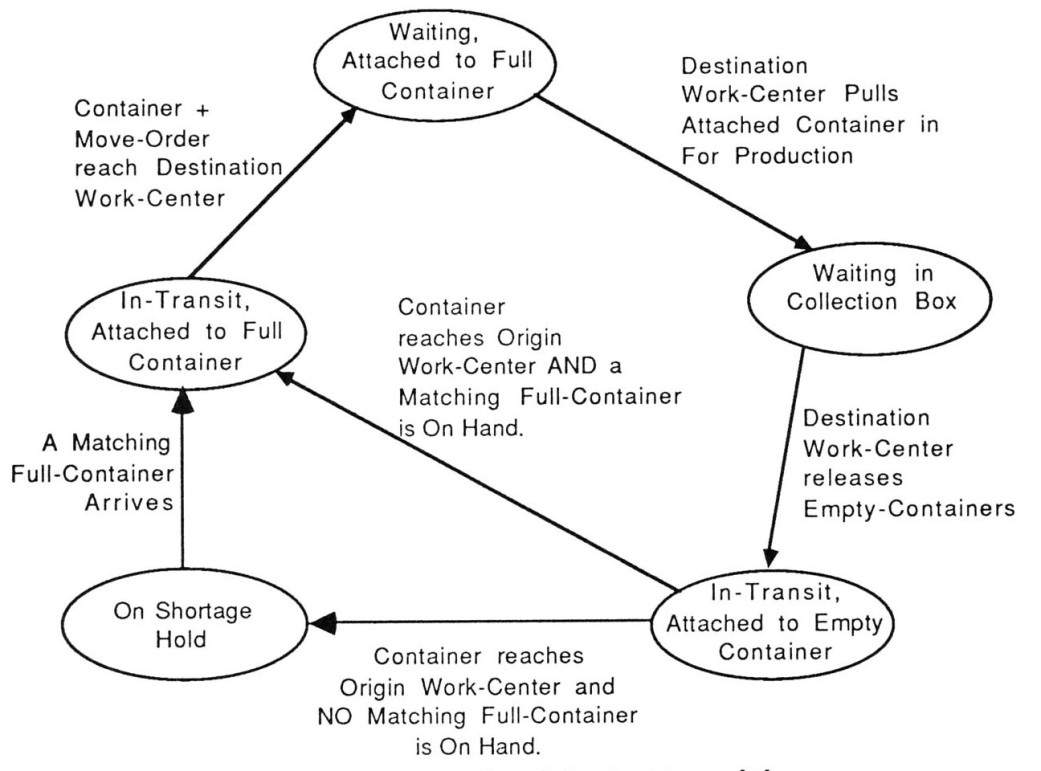 I used a simpler and more abstract graphic notation than VSM, and complemented the flow diagram with a state-transition diagram focused on what happens to a Kanban through the cycle. Working at the time on software development for Manufacturing Execution Systems (MES), I had found a formal similarity between the ASME symbols for process mapping and Tom DeMarco’s for data flow diagramming.