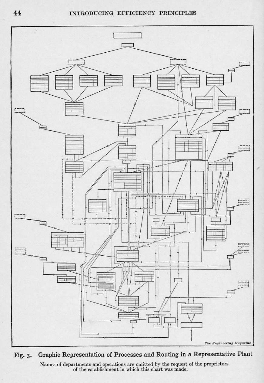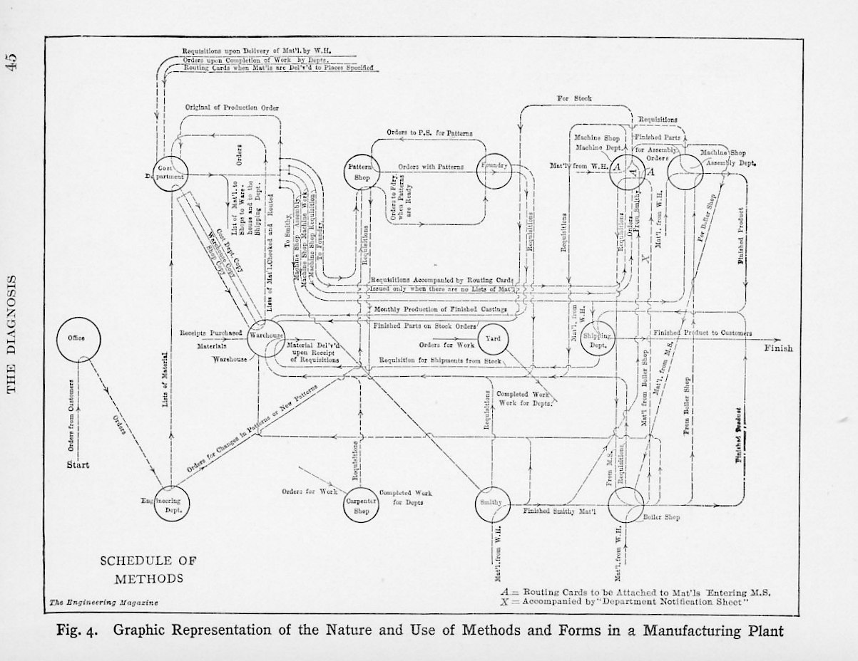 A few year ago, Bryan Lund pointed out to me a 1918 book by Charles E. Knoeppel entitled Installing Efficiency Methods, and I managed to buy a used copy from the Iowa State University Library that had last been returned on August 5, 1939. In the chapter on Diagnosis, I found the two following charts, respectively showing flows of materials and information in a factory. These are the earliest examples I know.