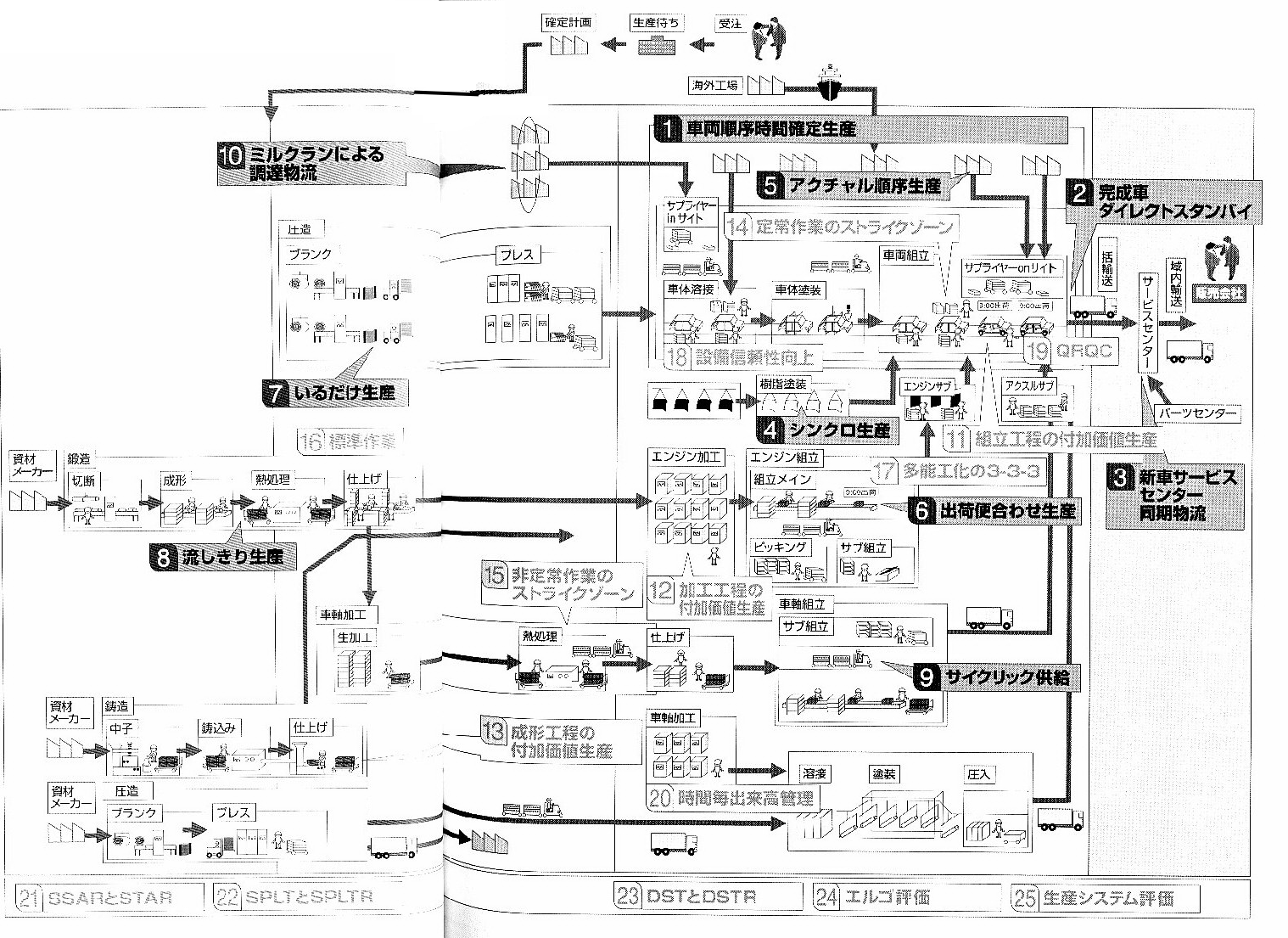 - The 2005 Nikkan Kogyo book about the Nissan Production Way ( 日産生産方式キーワード25) on pp. 20-21 has a material and information flow diagram of the entire car manufacturing process with numbered captions that point to sections of the book with details on each. It uses 3D pictograms specific to car making.