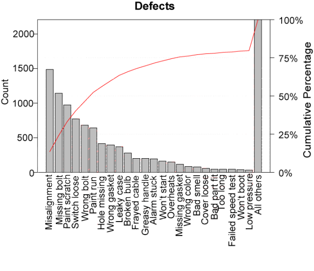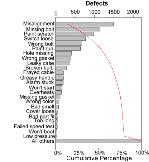 The traditional chart also uses vertical bars for categories that may have long names, and of which there may be many more shown than the five in Nancy Tague’s example. If a product has 100 defect opportunities, it may take the top 20 to account for 80% of the defects, still leaving a large bar for the “other” category. As a result, you may be forced to align the captions vertically or at a slanted angle, making you twist your neck to read them. What would be lost by using horizontal bars instead and having all the text in the same, horizontal orientation? Nothing, other than conformance with the textbook format.