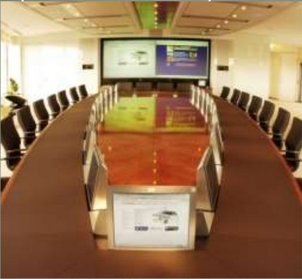 This picture, from the Toyota website, shows the obeya of the local Camry product launch team in Australia in 2006, with the 10-member team engaged by video-conference with the “global obeya” in Japan. The simultaneous launch of a car in many countries is not a project for a small team. This picture shows the obeya concept applied locally, where it can be, supplemented with IT for worldwide coordination. Note that the obeya contains a conference table but no desks.