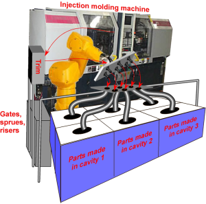 If you send a team on a factory tour, you want it to share what it learns with your entire organization when it returns. The notes taken on site and the comments made in daily debriefing meetings must be compiled into a presentation and a report for everybody else. Most visit hosts, however, make this difficult by not allowing you to shoot videos or even take pictures of their production lines. As a result, illustrations are limited to drawings from memory and published photographs. The pictures below contrast two views of a modification to an injection-molding machine that I saw at NIX in Japan. The mold has multiple cavities, and routing the parts from each cavity into a different bin helped detect quality problems. The picture on the left was drawn from memory, based on stock photos of injection-molding machines and robots; the picture on the right was provided by NIX. The drawing from memory is wrong in almost every detail, yet it accurately makes the main point.