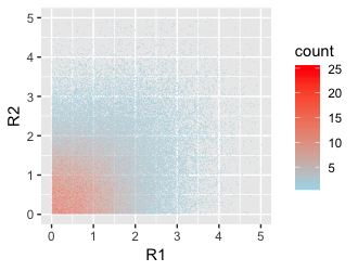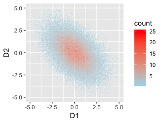 The plotting method manages to show 100,000 points on a few square inches without producing a large blob of overlapping points. The trick is to treat it as a heat map. The area is divided into small hexagons that are colored in various shades from blue to red based on the number of points they contain.